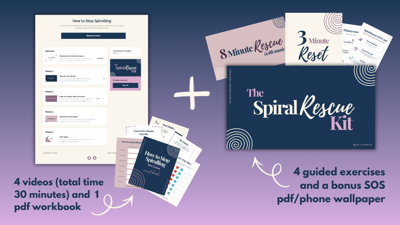 Reduce overthinking and find your calm in anxious moments with the mini course How To Stop Spiralling and Spiral Rescue Kit.